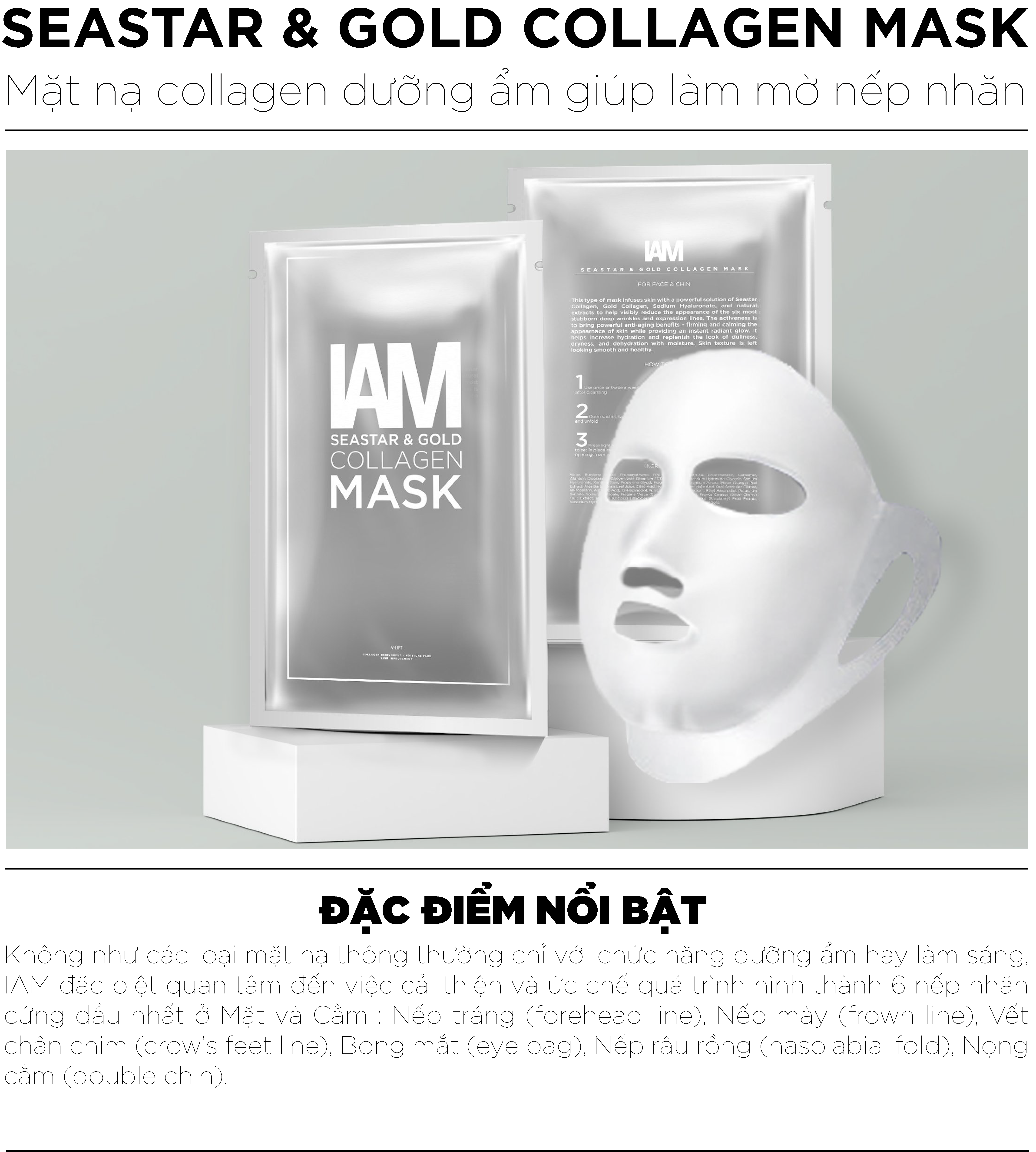 Không như các loại mặt nạ thông thường chỉ với chức năng dưỡng ẩm hay làm sáng, IAM đặc biệt quan tâm đến việc cải thiện và ức chế quá trình hình thành 6 nếp nhăn cứng đầu nhất ở Mặt và Cằm :