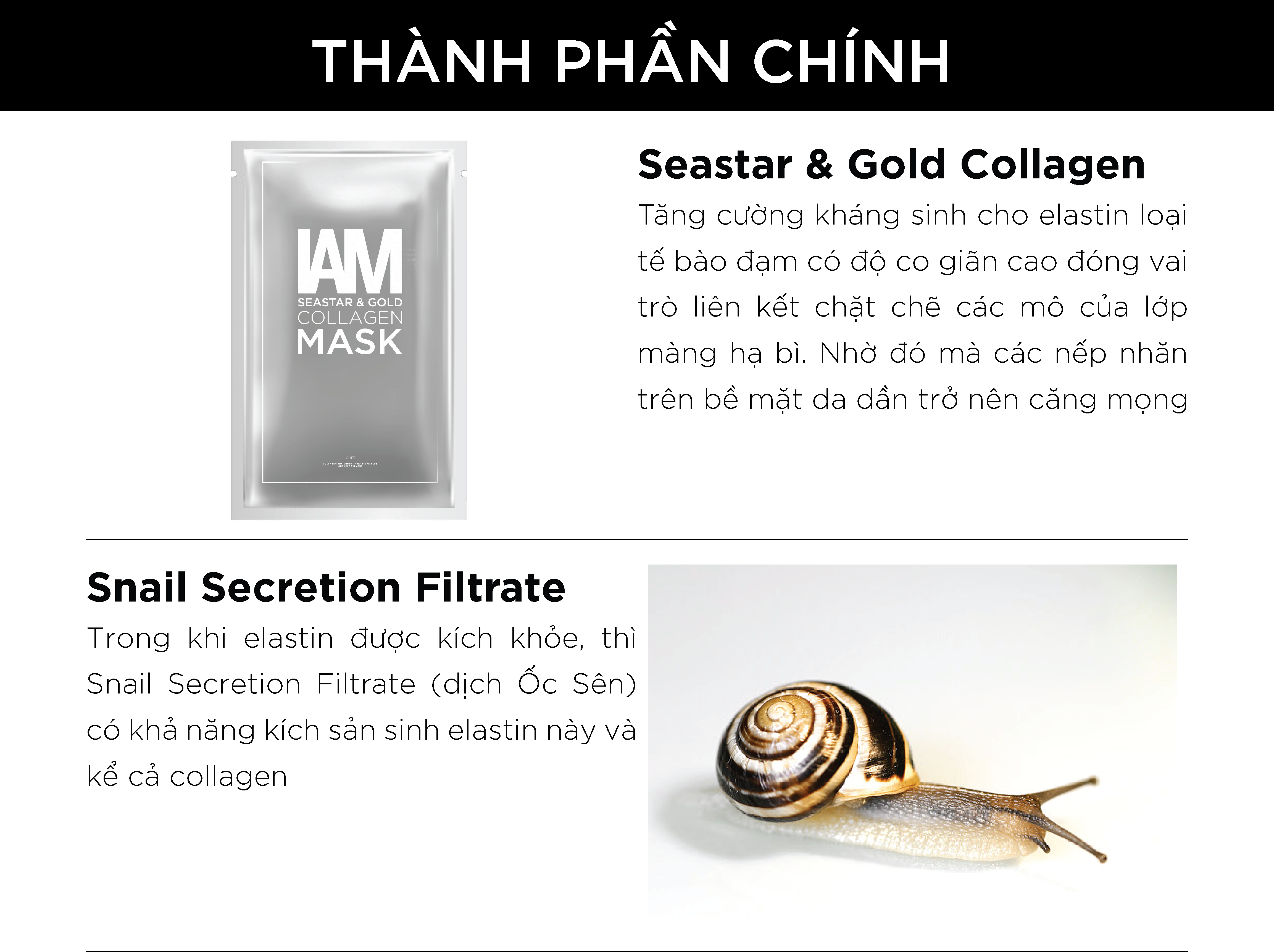 • Seastar & Gold Collagen – tăng cường kháng sinh cho elastin - loại tế bào đạm có độ co giãn cao đóng vai trò liên kết chặt chẽ các mô của lớp màng hạ bì. Nhờ đó mà các nếp nhăn trên bề mặt da dần trở nên căng mọng.
