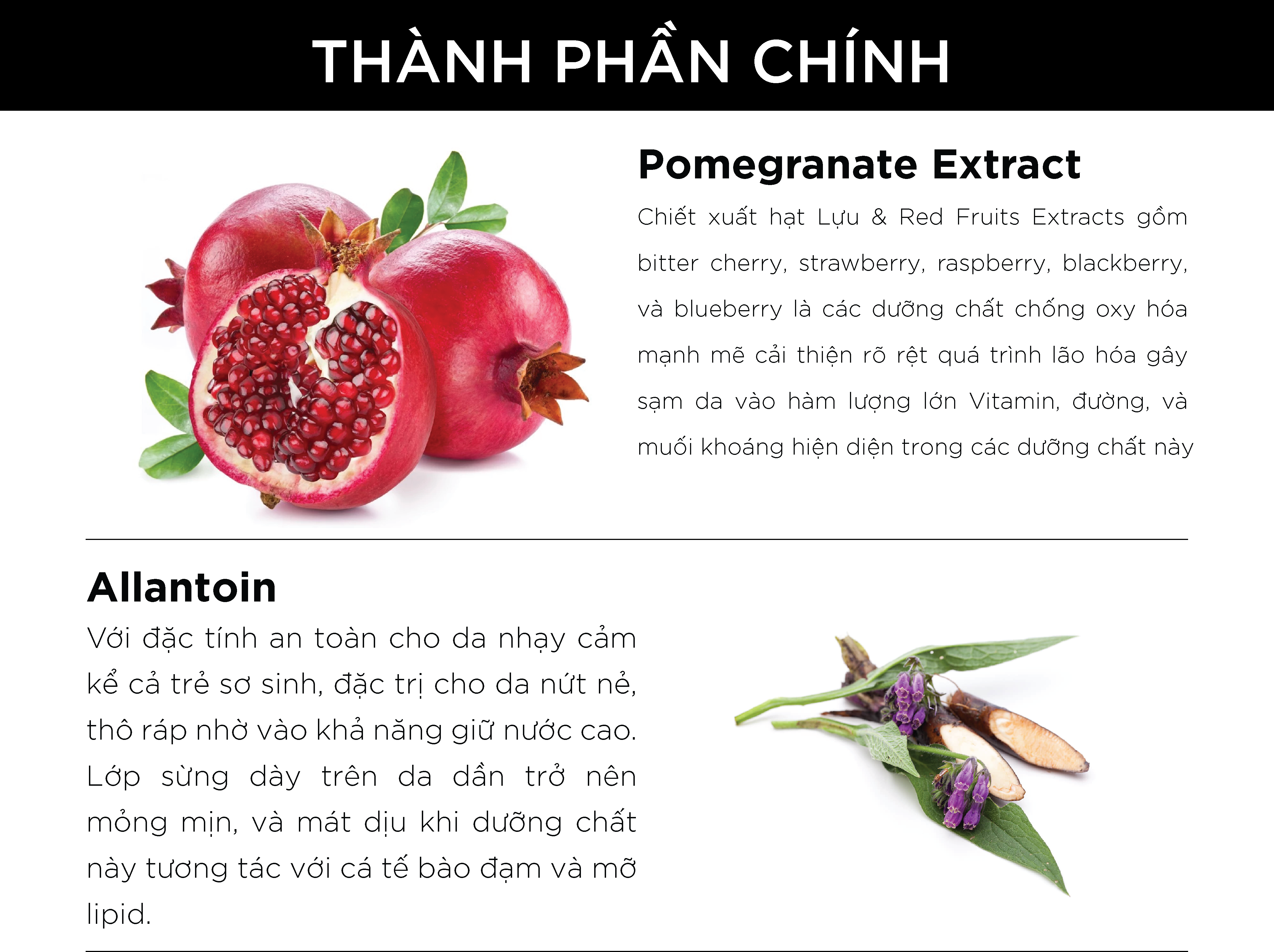 • Pomegranate Extract (chiết xuất hạt Lựu) & Red Fruits Extracts gồm bitter cherry, strawberry, raspberry, blackberry, và blueberry là các dưỡng chất chống oxy hóa mạnh mẽ cải thiện rõ rệt quá trình lão hóa gây sạm da vào hàm lượng lớn Vitamin, đường, và muối khoáng hiện diện trong các dưỡng chất này.