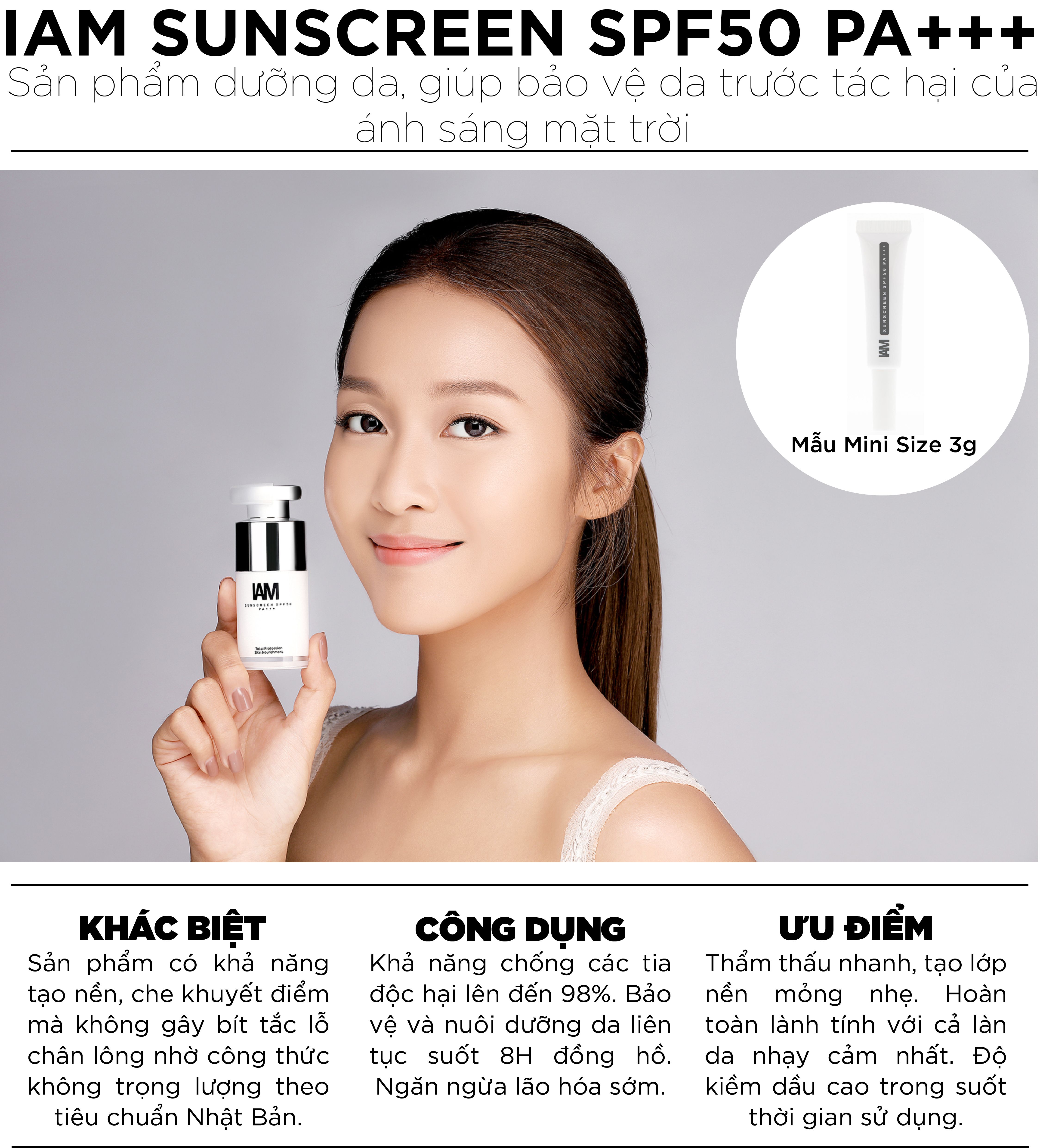 IAM SUNSCREEN SPF50 PA+++ thuộc thương hiệu IAM Cosmetics, chất lượng Nhật Bản đóng gói tại Thái Lan.
