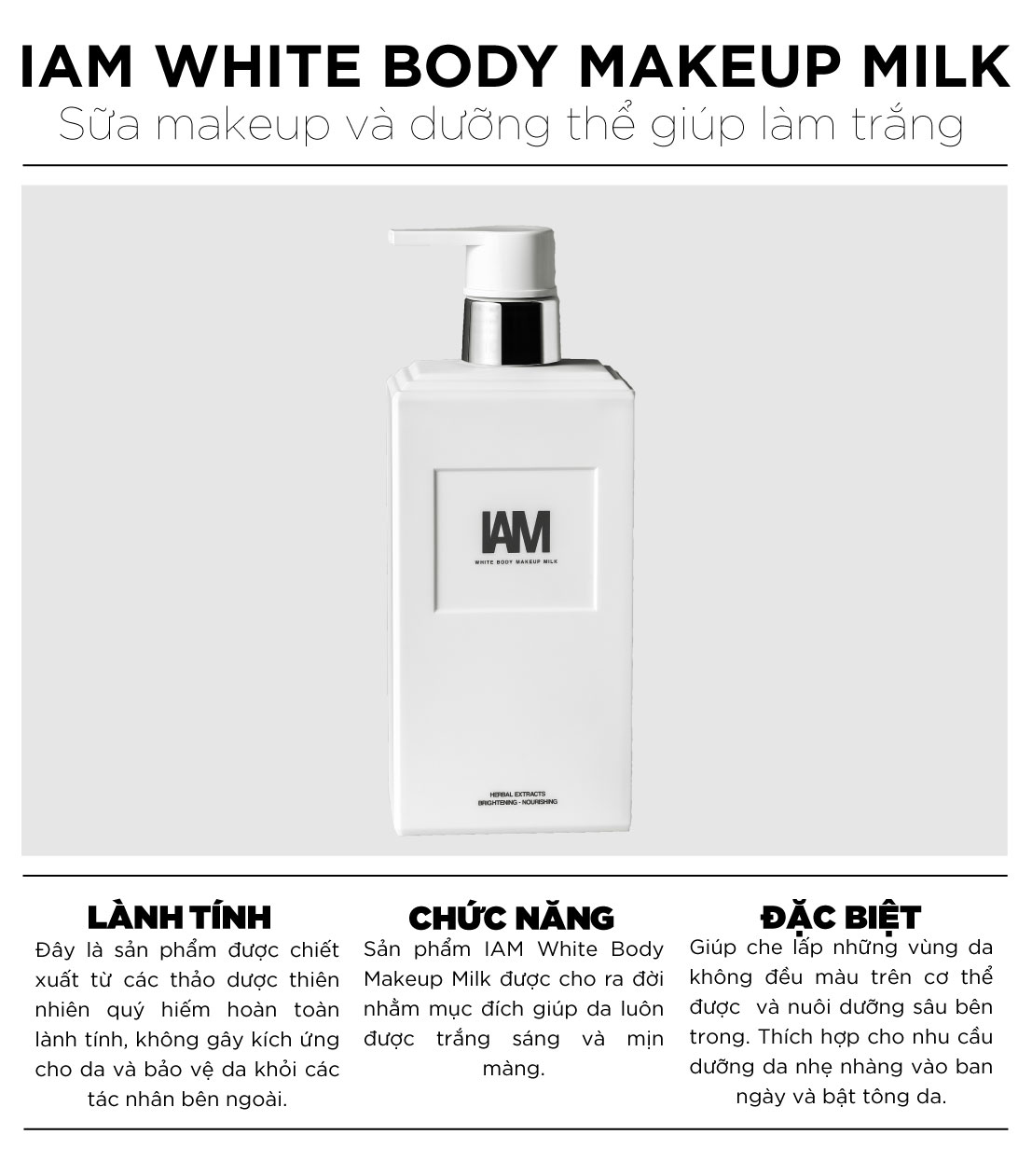 IAM WHITE BODY MAKEUP MILK thuộc thương hiệu IAM Cosmetics, chất lượng Nhật Bản đóng gói tại Thái Lan.